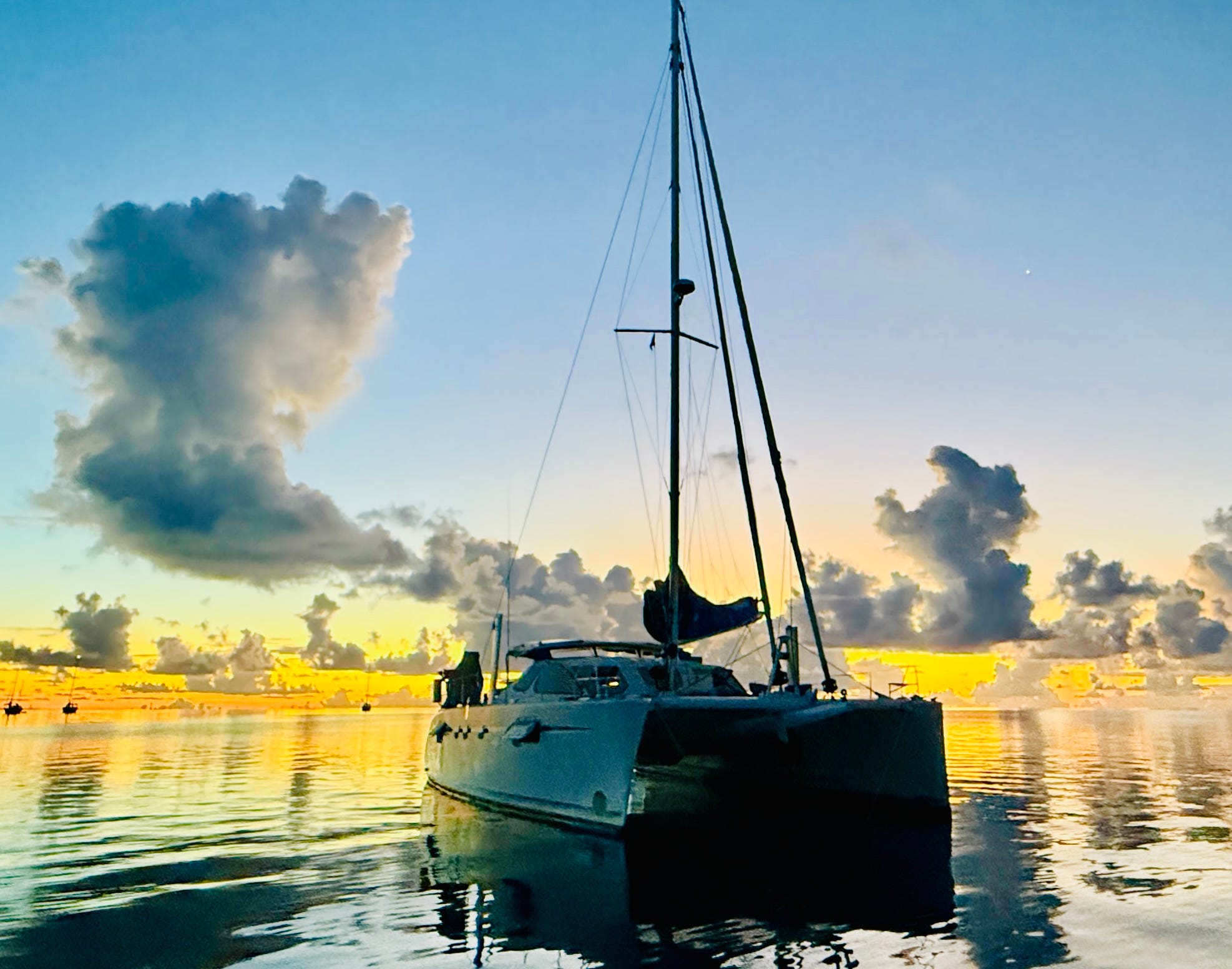 Catamarans are known for being comfortable live-aboard boats. Guests and crew are well separated in the hulls. The cockpit creates a giant “patio” conducive to easy outdoor living. Cats don’t lean or heel when sailing and they don’t roll around at anchor making housekeeping and cooking much safer and easier.