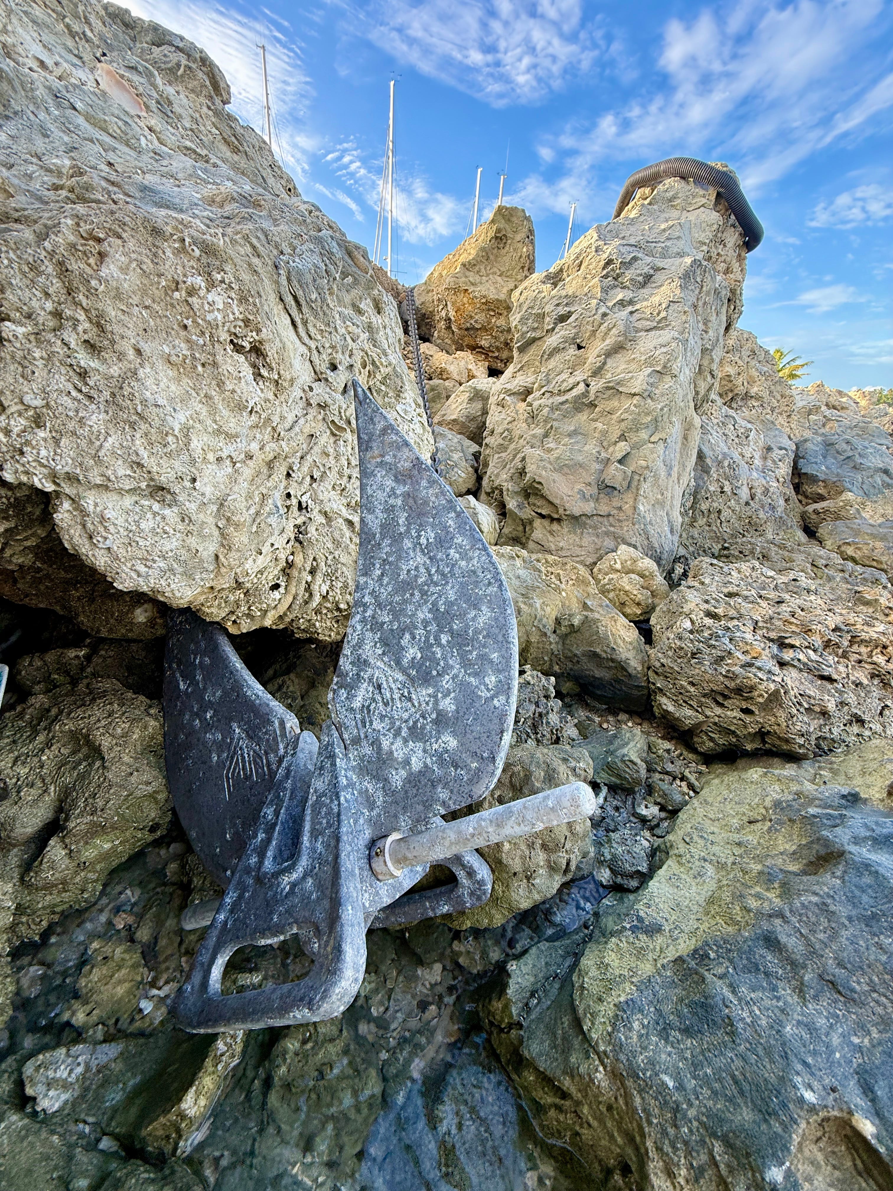 It was a long night. We had strong westerlies with squalls. We are rafted up with nine other boats—all of us with lines and anchors off our sterns onto the land berm behind us. We had mid-20 knot winds gusting to 44 knots during the squalls. It was enough to break loose our stern anchor, which was wedged between two boulders. It rolled one of the boulders completely up and out.