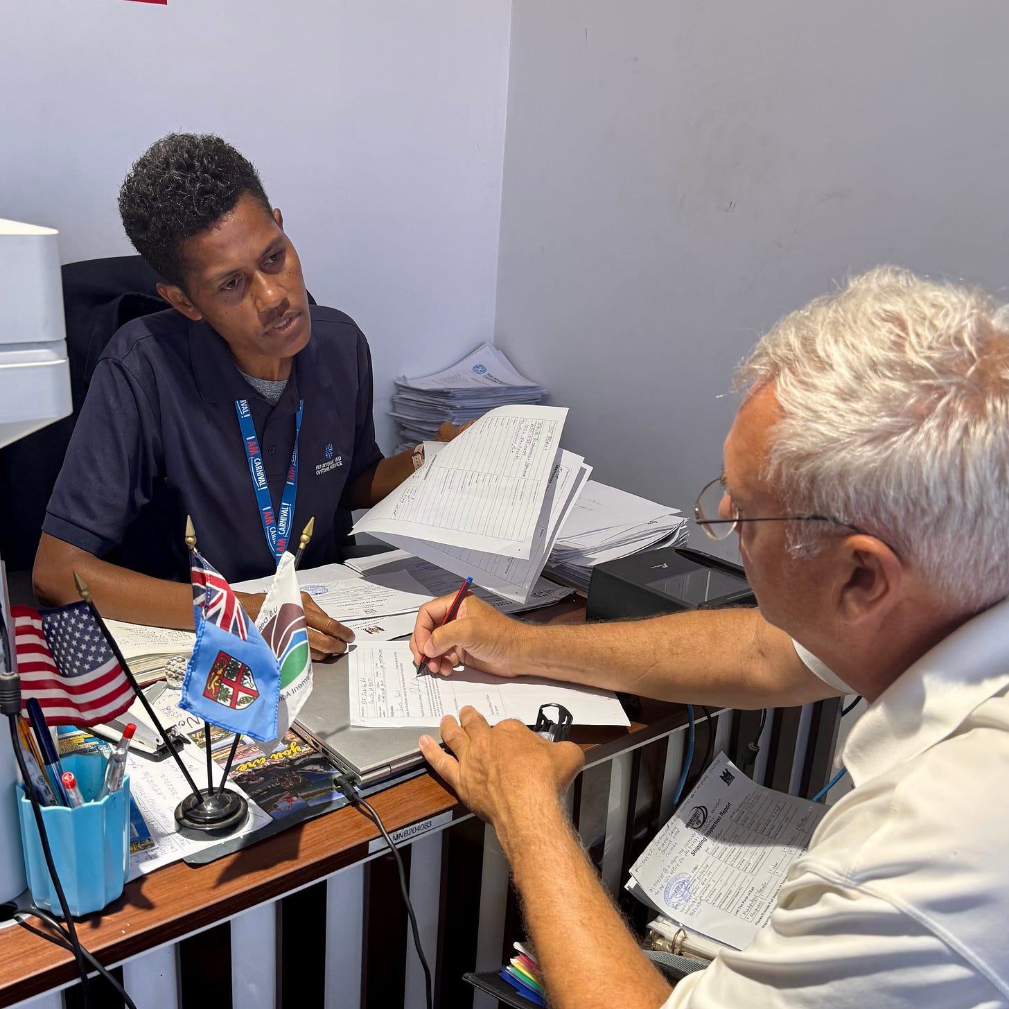 All is well. We’ve concluded the paper chase and successfully cleared customs and immigration in Fiji. We slipped our moorings and motor-sailed out of the Navula Pass bound for sea and New Zealand.