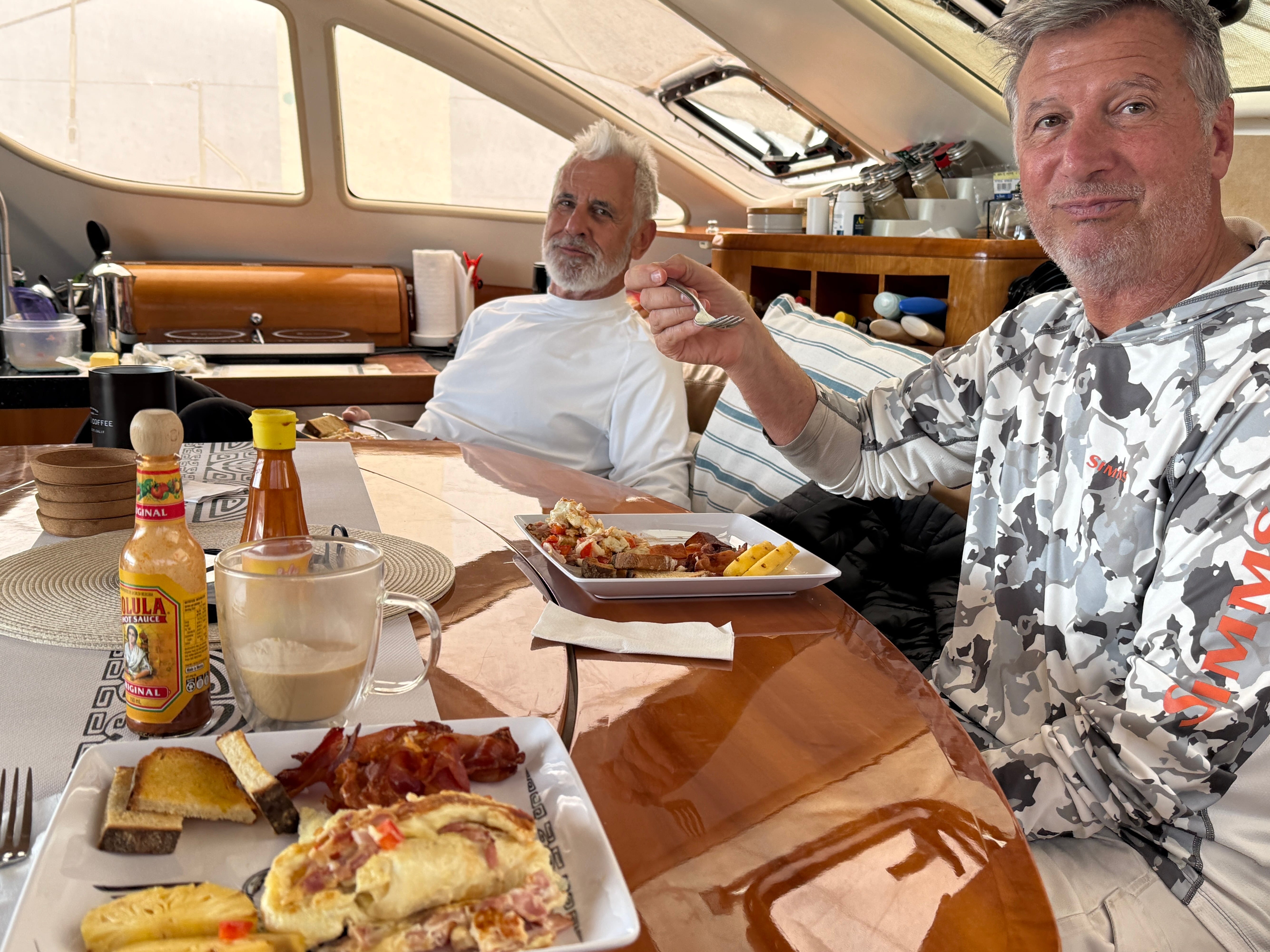 The seas are beginning to smooth out. Finally, after 3 days of a real washing machine. Dave and I feel like eating for the first time. Richard has whipped up an amazing breakfast. Imagine cooking while standing on a basketball on tilt-a-whirl. That’s cooking aboard Roam right now.