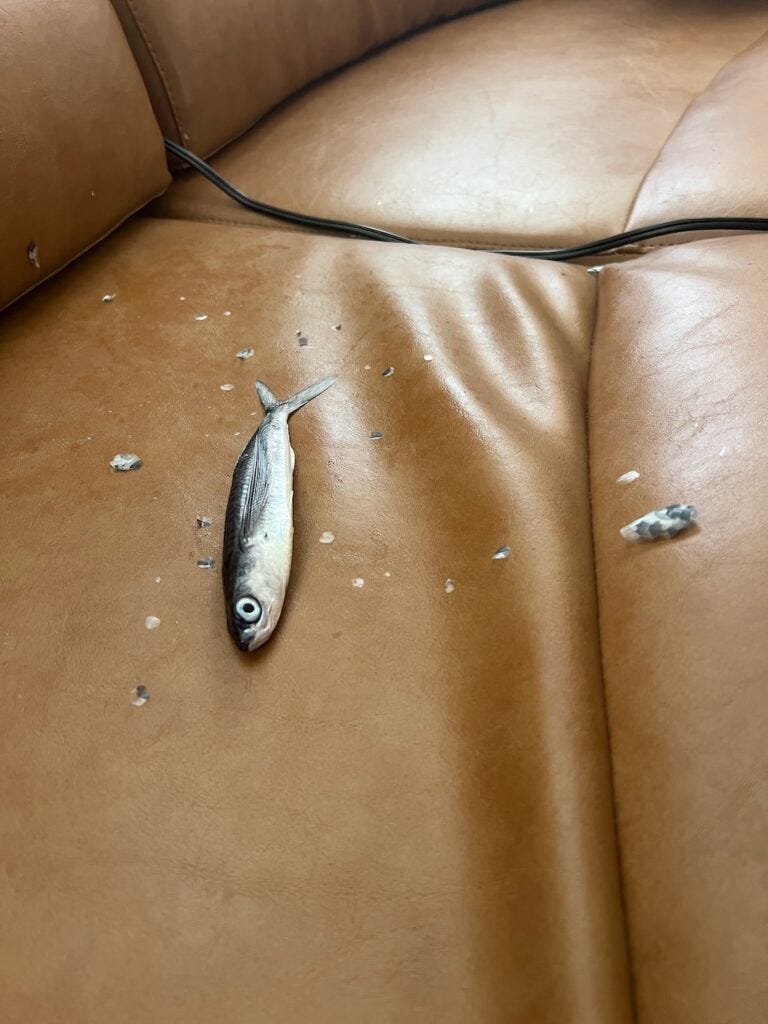 Pam woke up to find a dead flying fish on the couch in the saloon. He’d flown in through the open port light which we keep open for air. She was NOT happy.