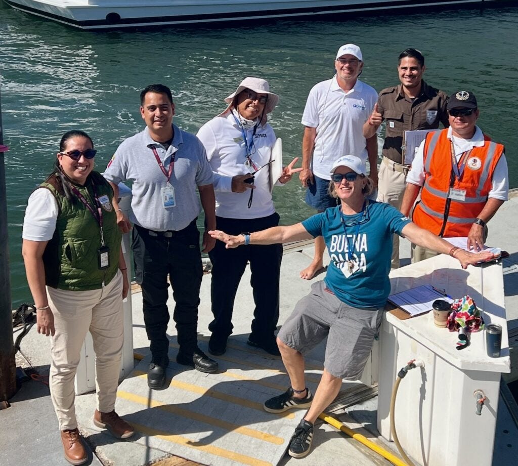Port captain, immigration, and customs arrive at 10am to stamp our passports and see us off the dock.