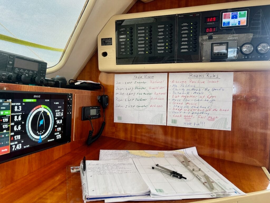 John, Mike, and I stand regular scheduled watches. I have the 8 to 12, John the 12 to 4 watch, and Mike the 4 to 8 watch. That gives us four hours on and eight hours off for plenty of rest. Pam and Joan rotate in the galley, keeping all of us healthy and fed.