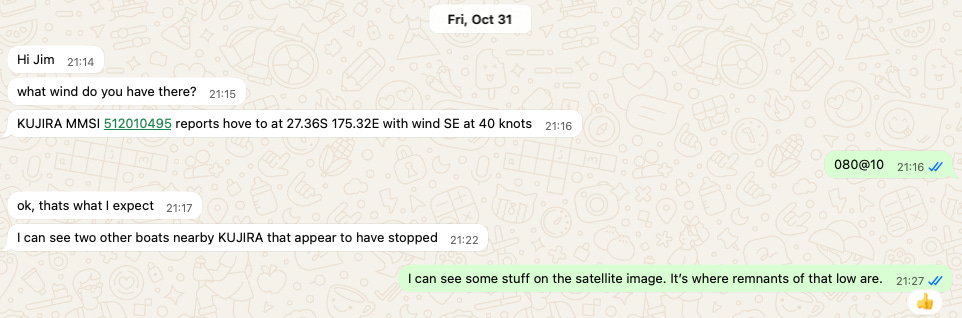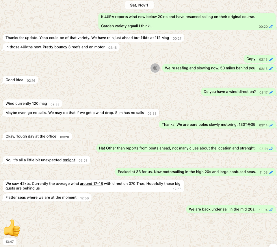 We were sailing along nicely in ten knots of breeze when I got a WhatsApp message from Passage Guardian’s, Peter Mott. “Hi Jim, what wind do you have there?” He went on to alert us that boats ahead of us were running into squalls with strong winds.