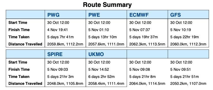 The tradional numerical modles like ECMWF, GFS, PWE, and PWG are deterministic. That is they are mathamatical algorithms that produce a single result. A set of predicted conditions in a format called GRIB (for Gridded, Binary). AI models are different (AiFS, and PWAi in this case). They are probabalistic. You feed them the starting conditions just as you do the deterministic models. But instead of running the algorithm, these AI models look back on historical weather and match that up with the starting conditions and use that to produce a forecast. Nobody is exactly sure how they work, but that’s what they do. And the results validate very well with the actual conditions—especially over the medium term which is what we rely on for risk management on an ocean passage.