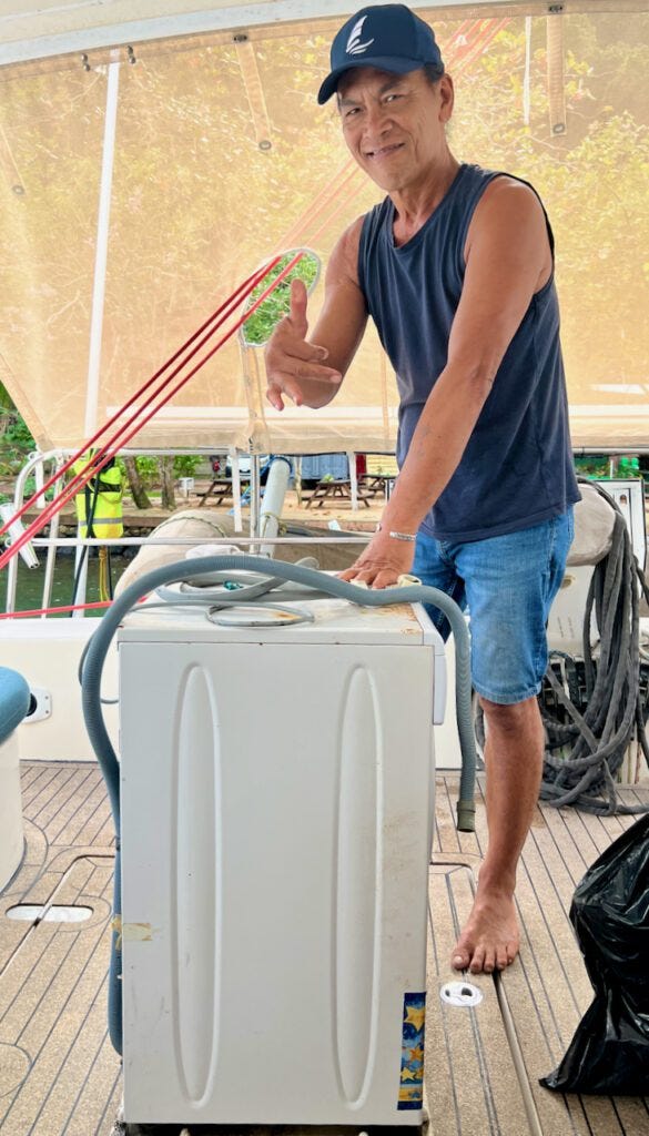 New washing machine -- a Winia Mini. I removed the old Candy Aquamatic and donated it to the marina manager. This required rebuilding the laundry cabinet. This required a trip to Polymat, Mo'orea's version of Home Depot. Getting 18mm marine plywood cut to size using my bad French took a while.