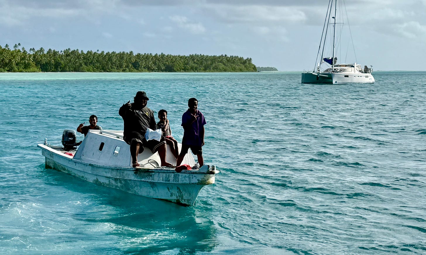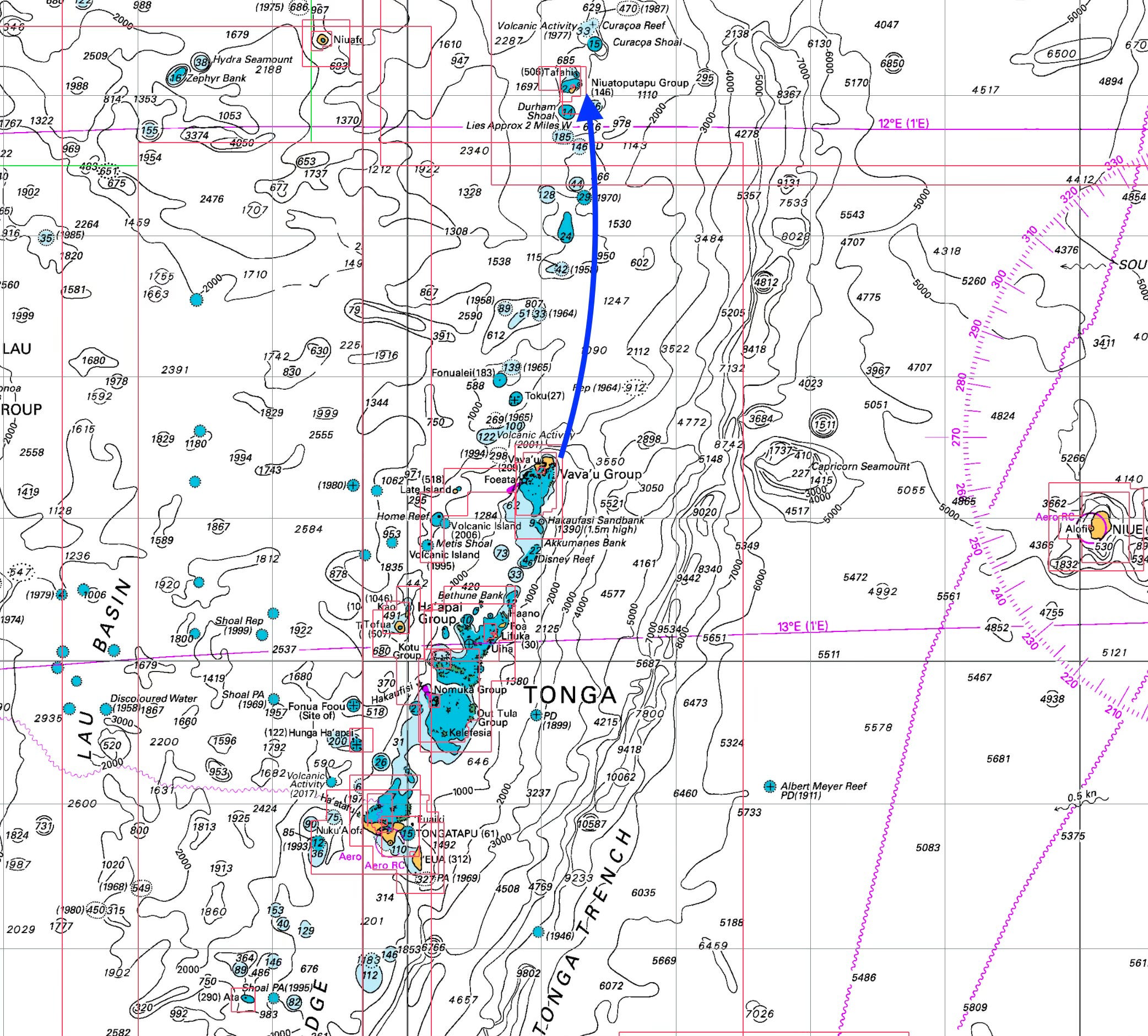 We enjoyed a fast, comfortable overnight sail from Vava’u. 15-22 knot southerlies with 1M - 1.5M quartering seas on a long 8 second period. We flew the main and Code65 with a reef overnight and a brief spell with the Solent. We arrived within 30 minutes of what our PredictWind software predicted.