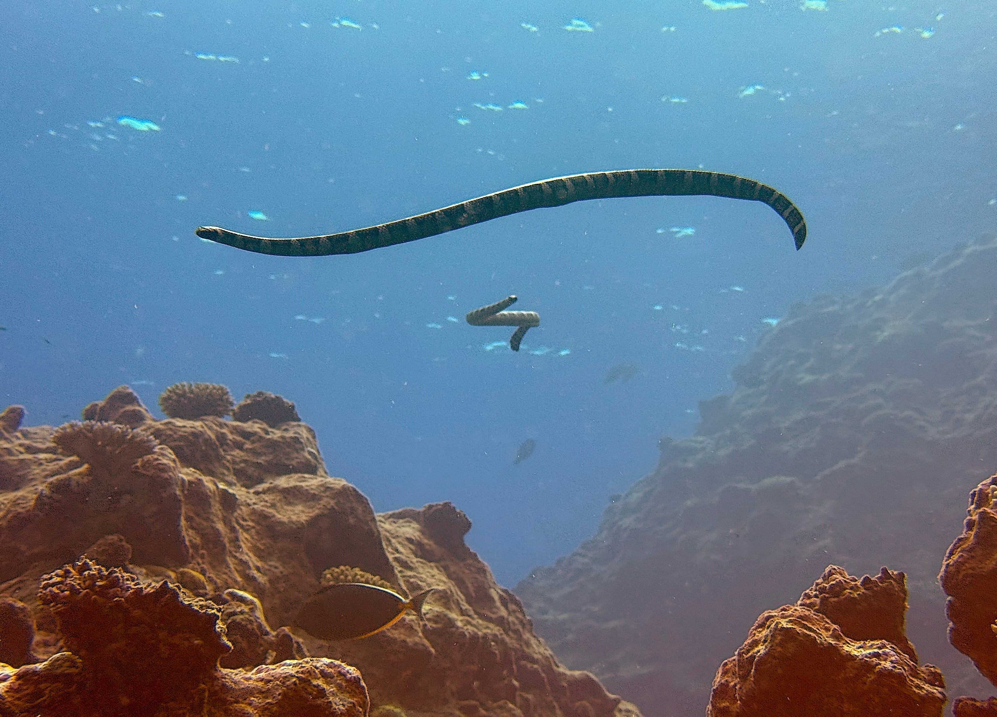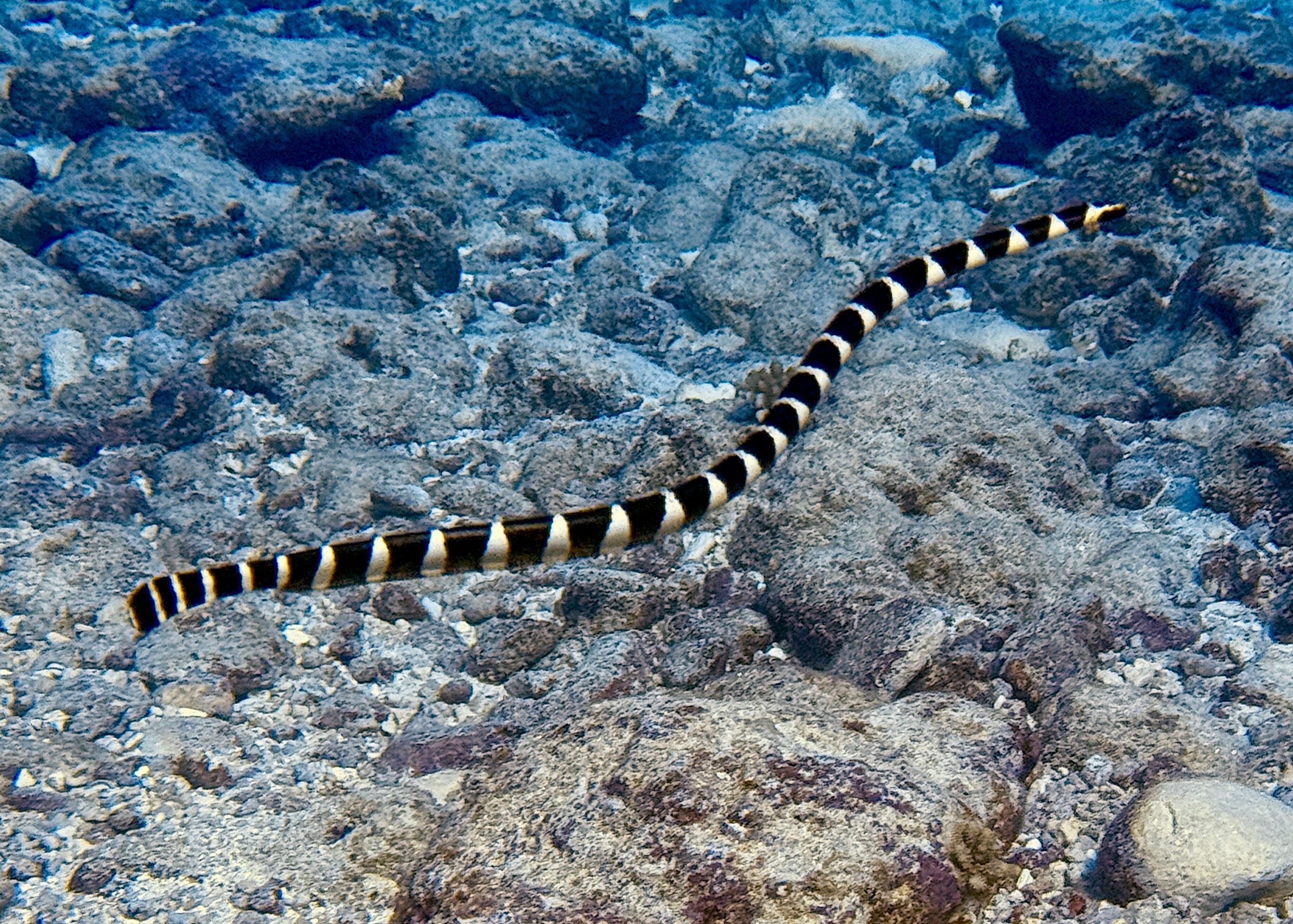 We saw hundreds, if not thousands, of Niue’s famous Katuali venomous3 sea snakes. Outside the caves, they swim freely. In the caves, they are wrapped up in tight mating balls—some several feet in diameter. Above the surface, they lounged on the stalagmites and rocks inside the caves.