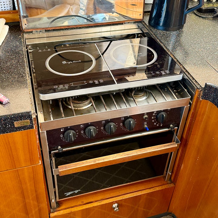Pam is upgrading her kitchen. She’s been cooking with a portable induction hob and a Breville convection oven (along with an Instapot, a microwave, and an electric kettle). We never use the original propane stove. It’s been lit it once—when testing it during the purchase survey. Cooking is so much faster and easier with induction. It doesn’t heat up the cabin like propane does. And we don’t have to spend time chasing down a source to fill our propane tanks in far-away places.