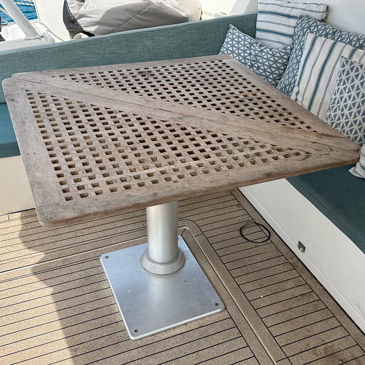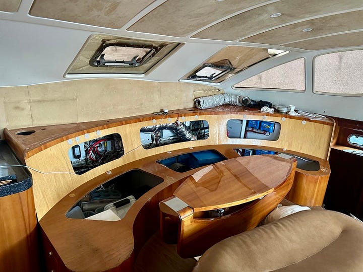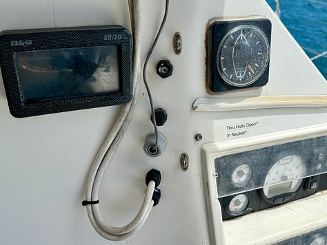 Sailing the tropics is an exercise in outdoor living. Our cockpit is our patio during the the time we are anchored (99% of the time). Over the years, it became festooned with old instruments, cables, snaps, screens, and other random fittings. These things and the holes they created spread like a pox. We are removing them, filling the holes, and painting the cockpit.