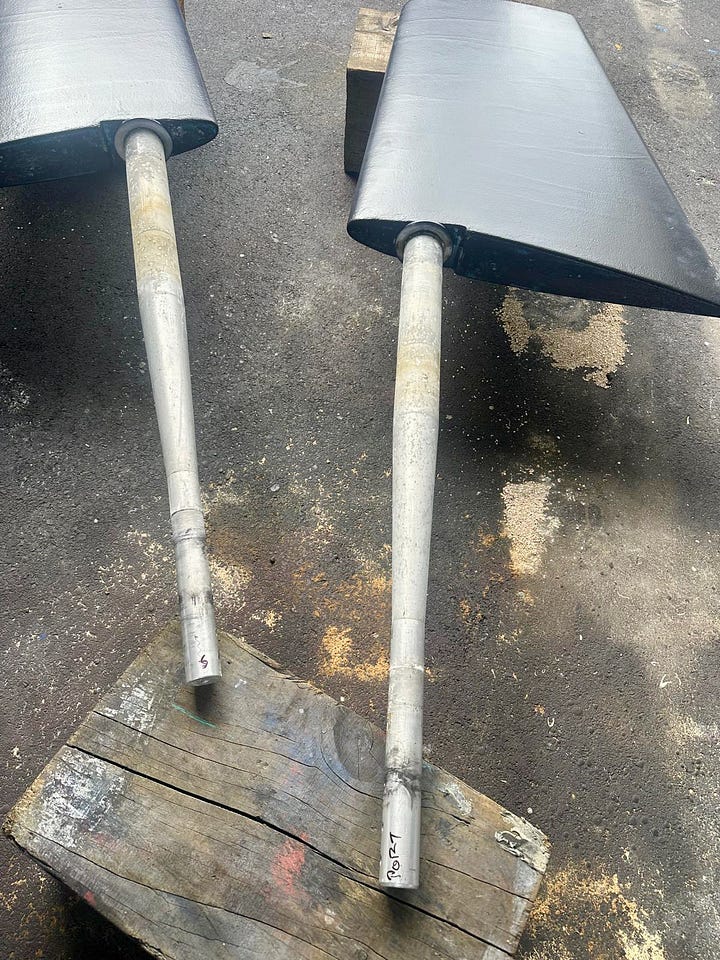 The bearings that hold them wear out. We had new ones made locally. Dropping the rudders allows us to inspect them and replace the bearings. JP3 Steering Systems makes our rudder bearings from “Ertalyte”. It’s a good choice. But a local manufacturer has a better version of it with improved self-lubricating properties. We’ll try it. Our project manager, Greg, figured this out and had them made.