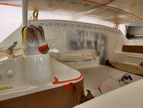 The yard figured out a way to back us into the paint shed up to the mast. That allowed them to seal off the cockpit area being prepped and painted without us having to pull the mast out of the boat. Painting the cockpit inside the shed keeps the paint out of the air and the overspray off the neighboring boats.