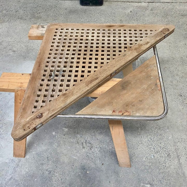 Replace table base. Fix table so it will fold up and refinish.