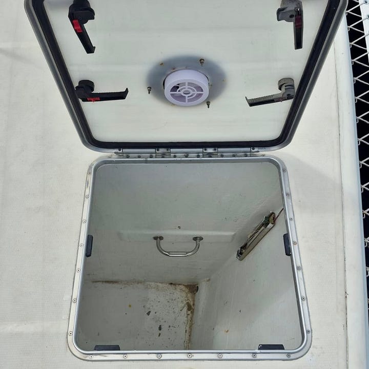 Hatches on the deck are a mixed bag. They can let in air and light at anchor. They also let in rain and seawater. Roam’s designer was not a big fan of them, and you’ll find very few deck hatches in his designs. We have four—two in each bow and two in each transom step. The bow hatches provide access to the bow lockers where we store sails, lines, and toys. The hatches in the sterns provide access to the engine rooms.