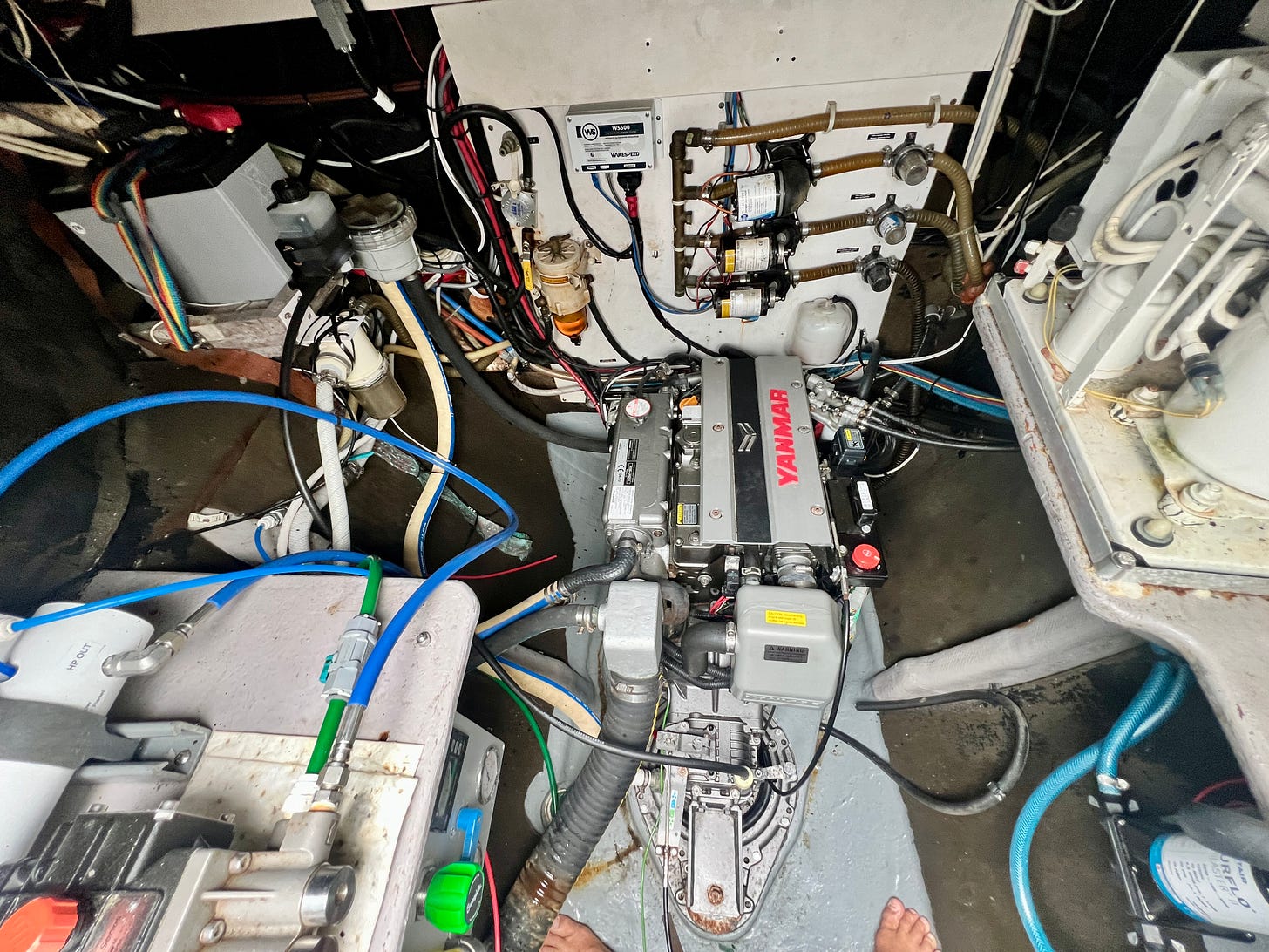 Our engines are new. They were due for their 1,000-hour service (well-maintained, they can last for 20,000 hours). Part of that service involves adjusting the valve clearances as well as examining the codes put out by the engine’s computer. I don’t mind doing routine oil changes, but we decided to leave the other stuff to the professional engine techs. Both engines and the generator got a clean bill of health from Marine Diesel Service.