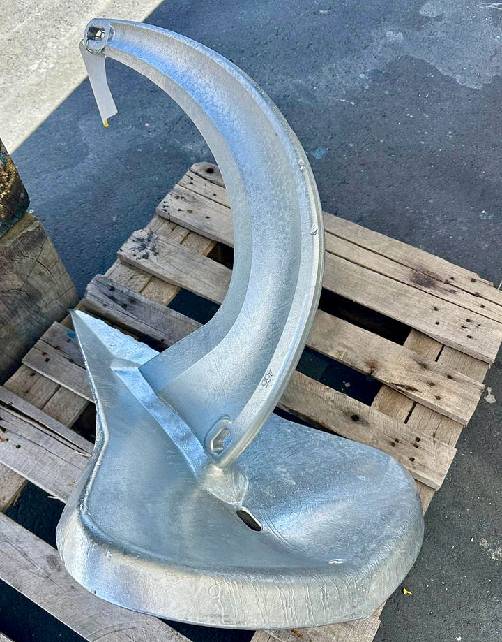 Our steel Rocna Vulcan anchor is galvanized to protect the metal and prevent corrosion. The anchor takes a beating. The galvanizing gets compromised. Greg had it sandblasted and re-galvanized using Rocna’s recommended process. Sailors develop a close relationship with their anchors. Have I mentioned how much I love this anchor?