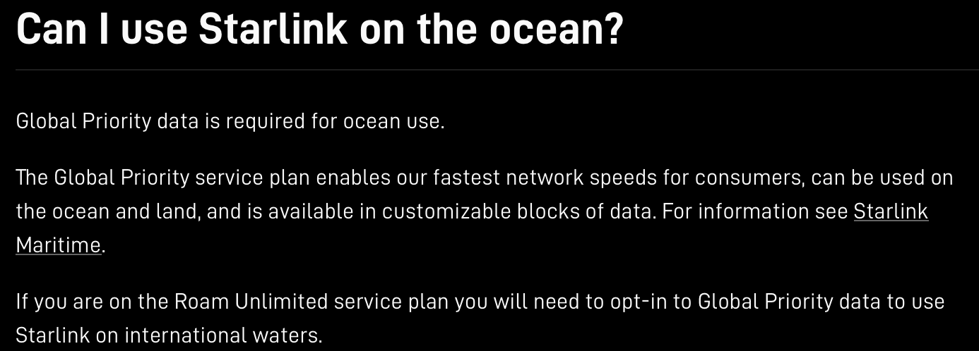 Here is what Starlink has to say about “ocean-use” with the Roam-Unlimited plan: