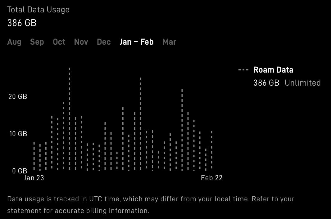 We use 300GB to 400GB of data each month when we are near land and running on “unlimited” data. This with no effort to control or manage the data usage of our various devices. We have two laptops, two iPhones, one iPad, one Smart TV, a PredictWind Datahub, and our Victron Cerbo all connected.
