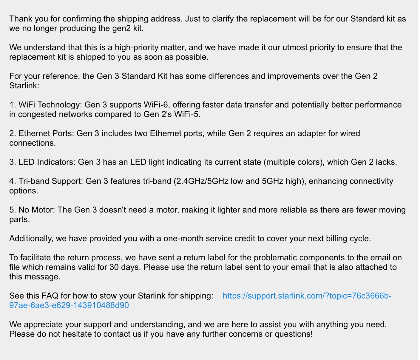 For our latest replacement, Starlink is shipping us a V3 dish. They no longer offer Gen2 dishes in our part of the world. We’ll need to work out a new mount for that.