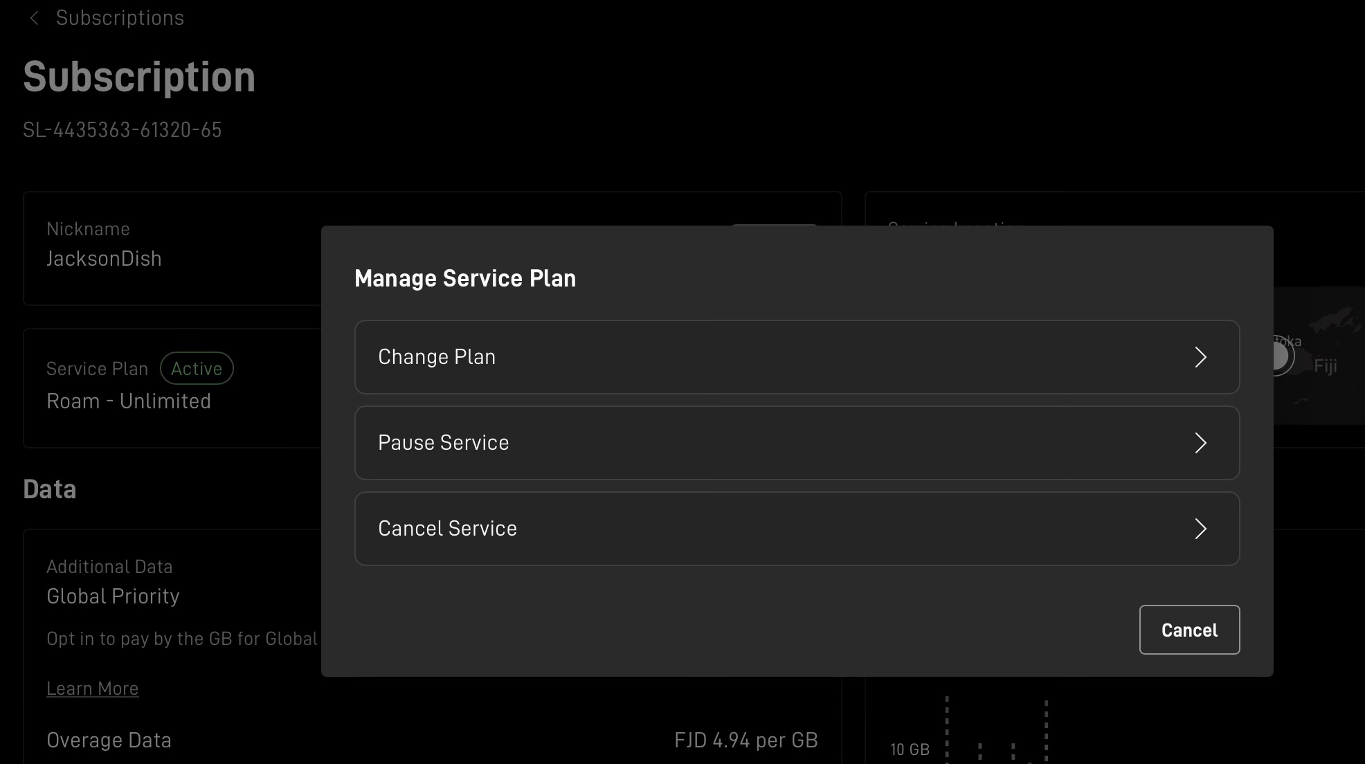 We hope to continue using our Roam-Unlimited plan with a Fiji service address, and enabling Global Priority data when offshore.