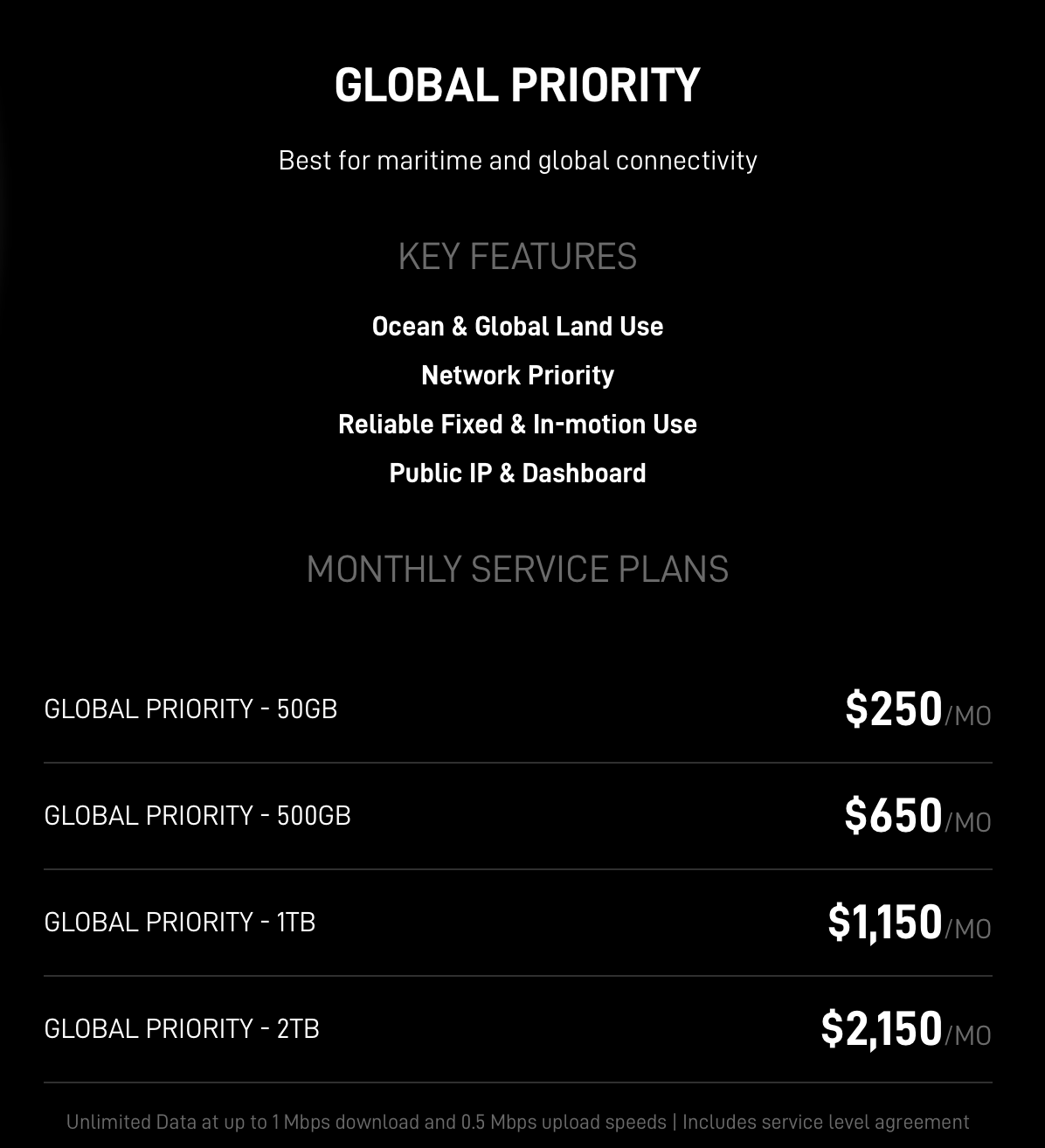 Otherwise, the Global Priority plan at $650/month is the worst-case scenario. It’s expensive, and a big jump from $100/month. If you want high-speed, low-latency internet in the ocean, it’s your only option.