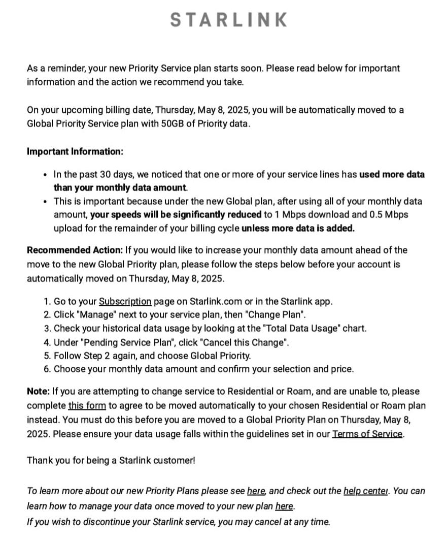 In September and October of 2024, some subscribers on some plans in some countries got emails from Starlink announcing the “Removal of Priority Data for Roam Service Plans.”