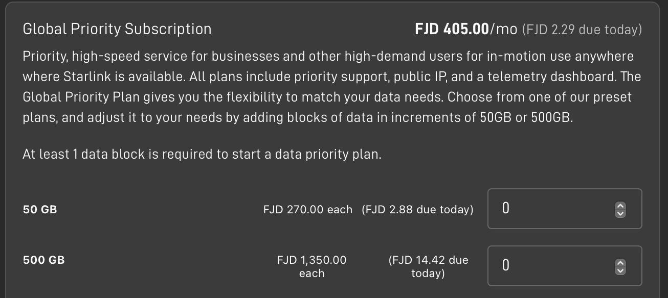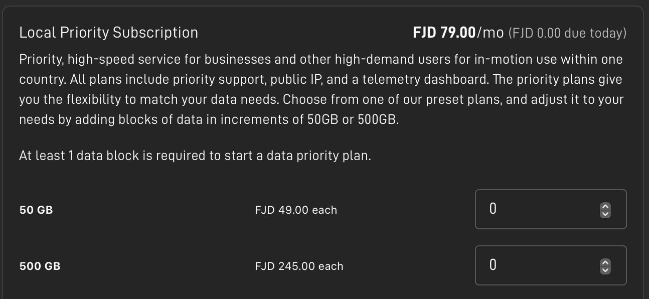 The Local and Global Priority plans for business users have two parts: a monthly terminal fee and a per-GB data block fee. The price varies by service location, with Fiji being one of the least expensive.