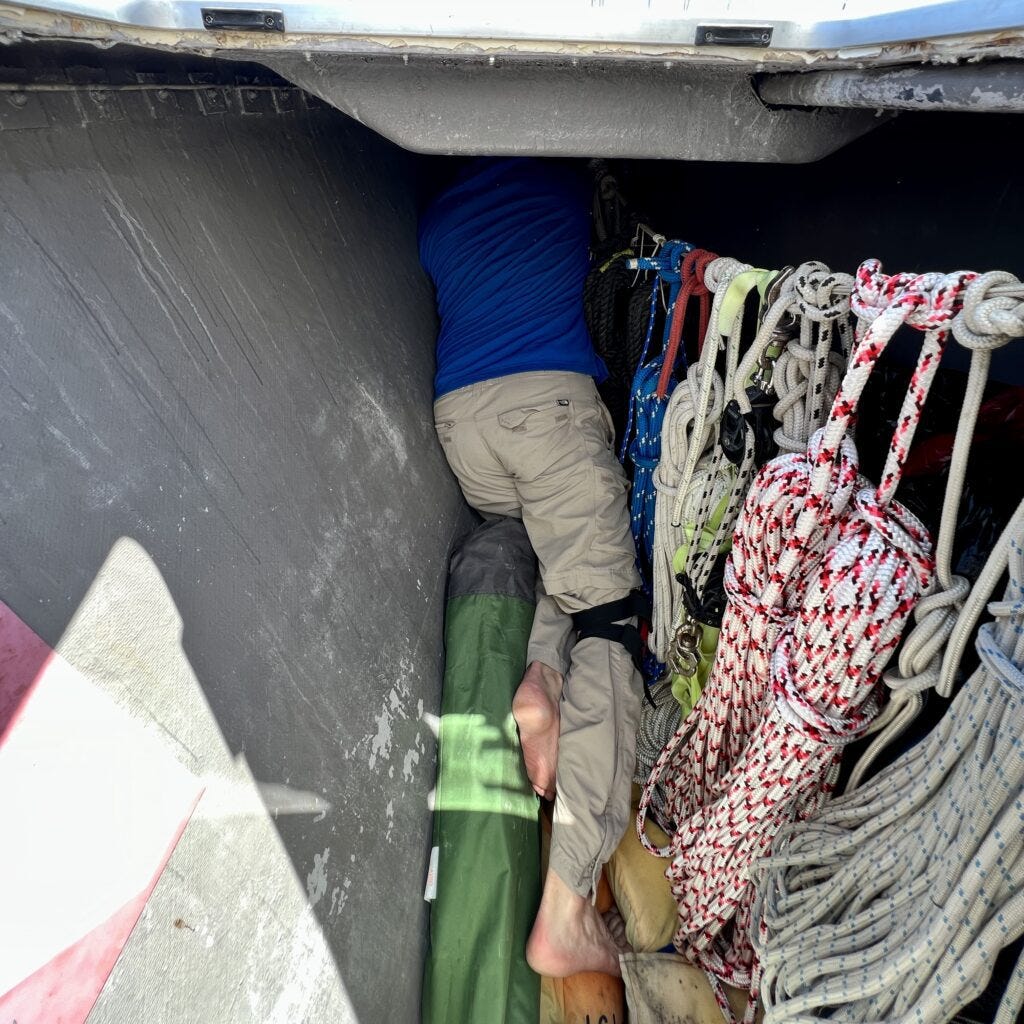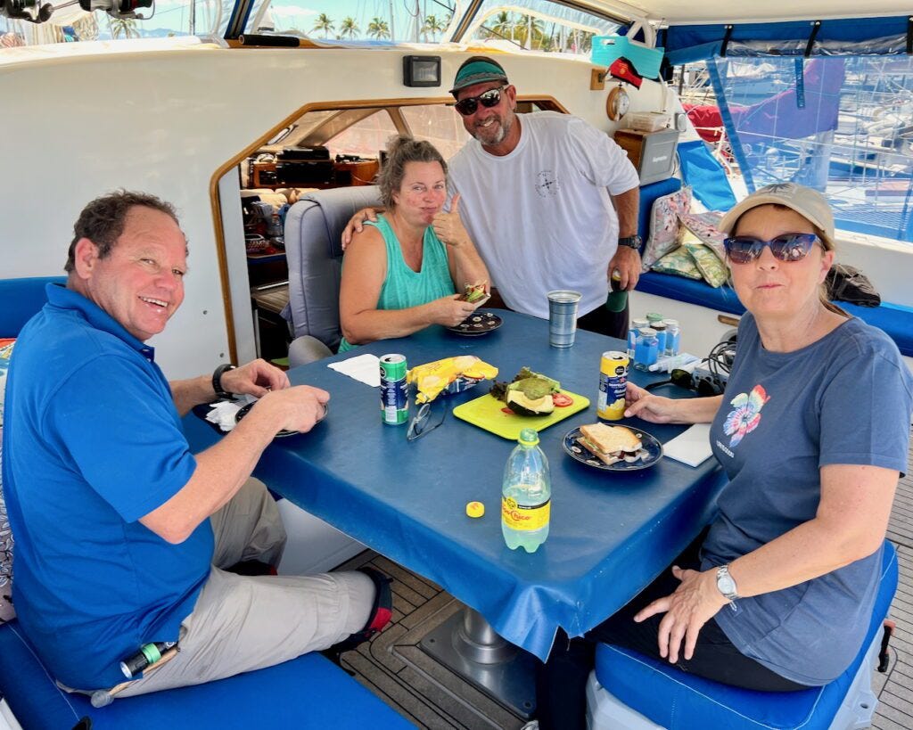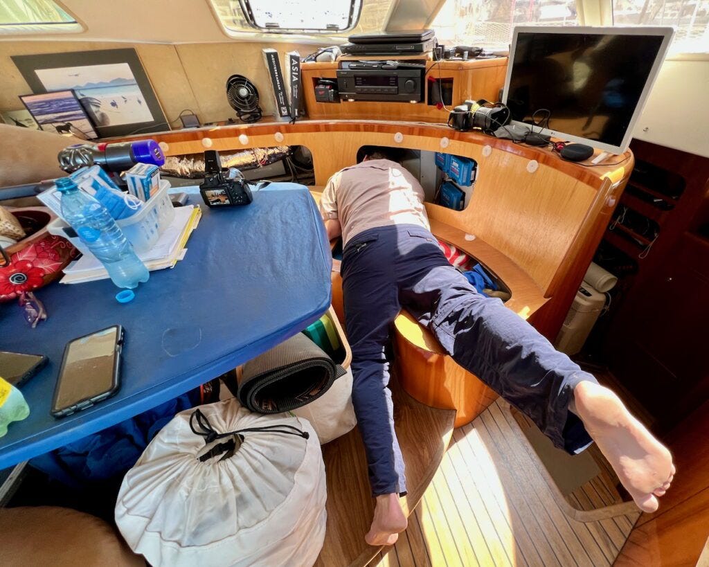 Ultimately, Bill pronounced the boat in fine health and a good value — especially for her age. He wanted us to modify the propane locker to better isolate the tank, and he wanted us to improve the passive ventilation in the battery and inverter space under the saloon settee. OK, we can do that, especially since we’re going to remove the propane system anyway. That was it! He had pages and pages of notes and ideas we discussed, and those recommendations are on my project list. But for seaworthiness and insurability, we were good to go.